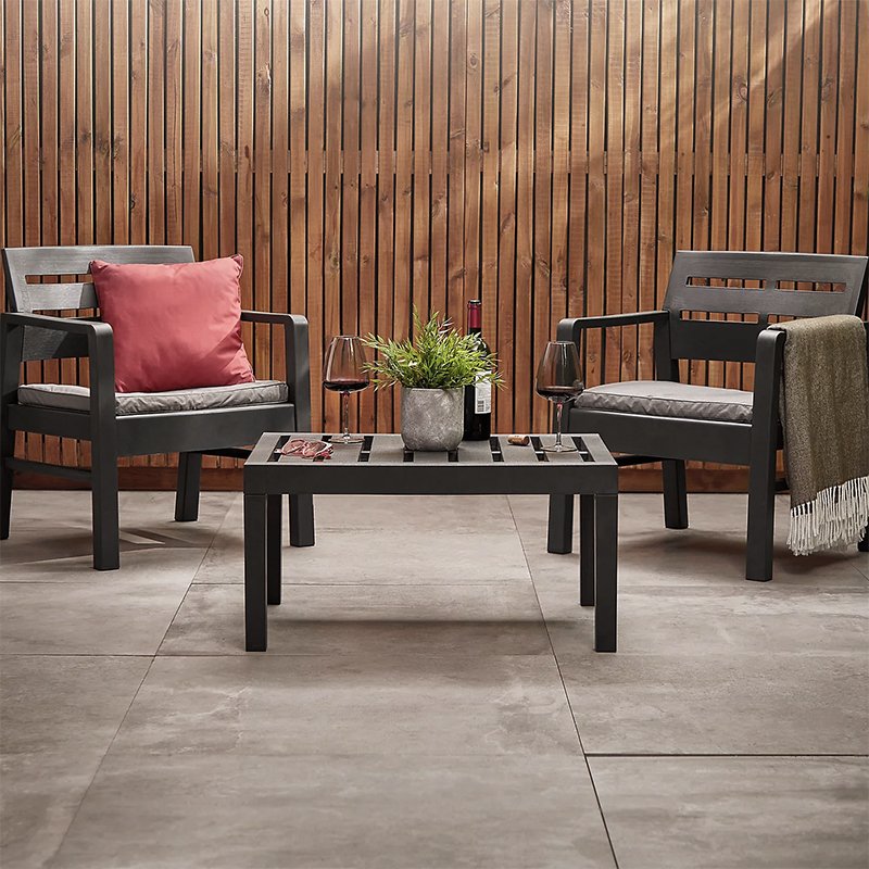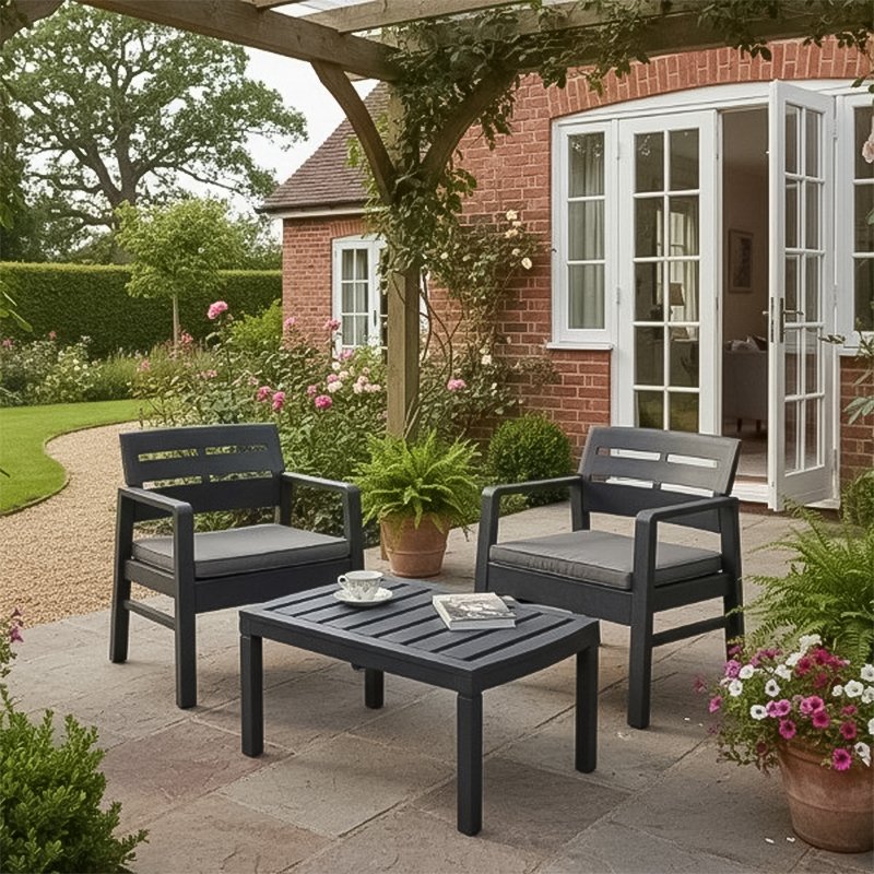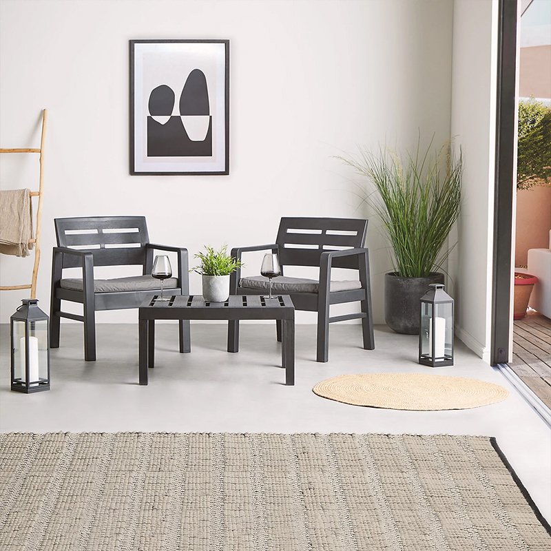 Baštenski set LOMBOK predstavlja elegantan i praktičan set dizajniran i proizveden u Italiji, u modernoj tamno antracit sivoj boji sa sivim jastucima. Izrađen je od livene plastične smole koja verno imitira pleteni ratan, a istovremeno je otporna na kišu, UV zračenje, slanu vodu, hlor i kreme za sunčanje. Zahvaljujući izdržljivim materijalima i jednostavnom održavanju set je pogodan za korišćenje tokom cele godine.