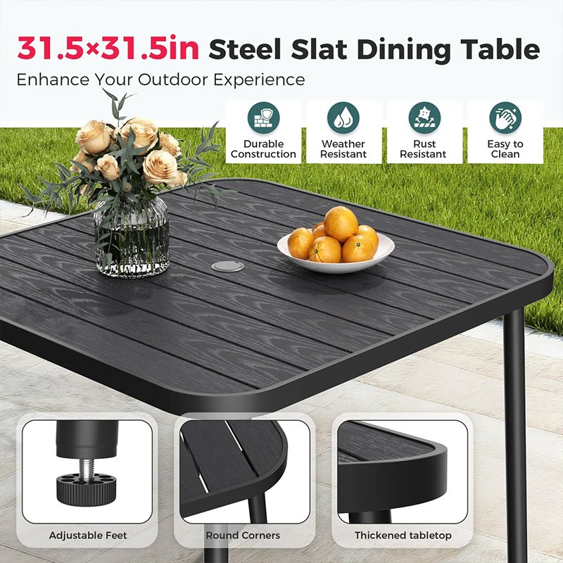 | Set sadrži: | Dimenzije: ( D׊×V ) | | Sto ( x1 ) | 80 × 80 × 72 cm | | Stolice ( x4 ) | 56 x 63 x 89 cm | | Materijal | PVC, čelik | | Boja | antracit (efekat drveta) | Baštenski set ARUBA predstavlja praktičan trpezarijski set od 5 delova koji se sastoji od stola i četiri stolice, idealan za uživanje u obrocima na terasi, u bašti ili dvorištu. Sedišta i nasloni izrađeni su od izdržljivog PVC-a, dok ploča stola sa efektom drveta unosi prirodan izgled u prostor. Stabilan čelični okvir sa praškasto farbanom završnom obradom u antracit boji obezbeđuje dugotrajnost i otpornost na spoljne uslove.