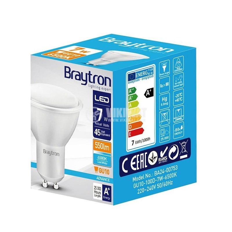 28053 • Brend: Braytron • Grlo: GU10 • Jačina: 7W • Boja svetla: 6500k • Dimabilnost: NE |