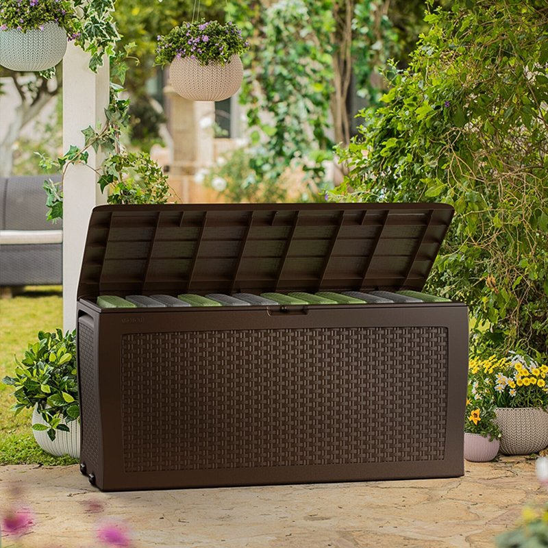 | Kapacitet | 270 l | | Materijal | PE ratan | | Dimenzije | 117 x 45 x 57cm | | Težina | 8 kg | | Boja | braon | Kutija za odlaganje SAMOA kombinuje funkcionalnost i izdržljivost, pružajući praktično rešenje za skladištenje. Poklopac može izdržati opterećenje do 200 kg, dok je materijal otporan na atmosferske uticaje i UV zračenje. Ugrađene ručice i točkići omogućavaju lako premeštanje, a montaža je jednostavna i brza, bez potrebe za alatom.