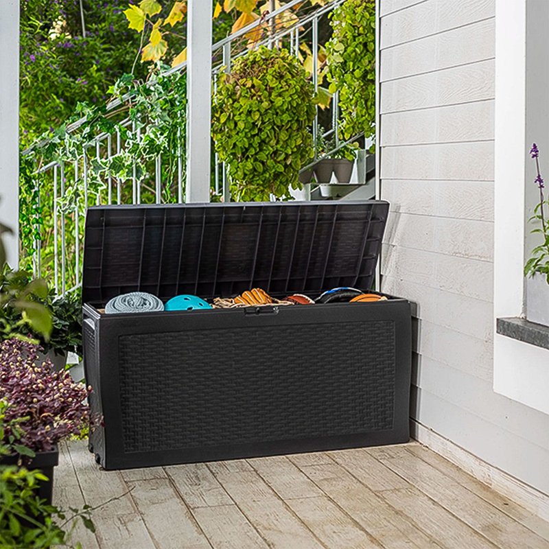 | Kapacitet | 270 l | | Materijal | PE ratan | | Dimenzije | 117 x 45 x 57cm | | Težina | 8 kg | | Boja | grafit siva | Kutija za odlaganje SAMOA kombinuje funkcionalnost i izdržljivost, pružajući praktično rešenje za skladištenje. Poklopac može izdržati opterećenje do 200 kg, dok je materijal otporan na atmosferske uticaje i UV zračenje. Ugrađene ručice i točkići omogućavaju lako premeštanje, a montaža je jednostavna i brza, bez potrebe za alatom.