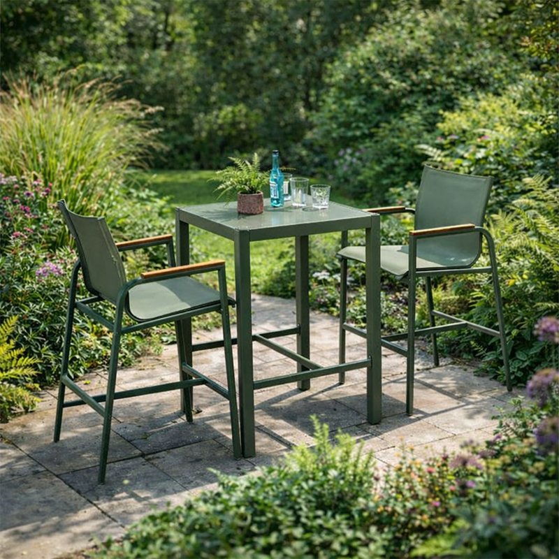 | Set sadrži: | Dimenzije: ( D׊×V ) | | Visoki sto ( x1 ) | 70 x 70 x 103 cm | | Barske stolice ( x2 ) | 44/67 × 57 × 113,5 cm | | Sedište / naslon | plastična tkanina | | Materijal | nerđajući čelik sa praškastim premazom | | Boja | zelena, drvo | Baštenski set OLIVE sa visokim sedenjem predstavlja praktičnu trodelnu kompilaciju idealnu za balkon i manje prostore. Čelični okvir sa praškastim premazom obezbeđuje stabilnost i otpornost za spoljašnju upotrebu, dok drveno-plastični nasloni za ruke daju dodatnu estetsku notu. Tekstilna sedišta i nasloni pružaju udobnost, a sto sa staklenom pločom omogućava lako i jednostavno održavanje.
